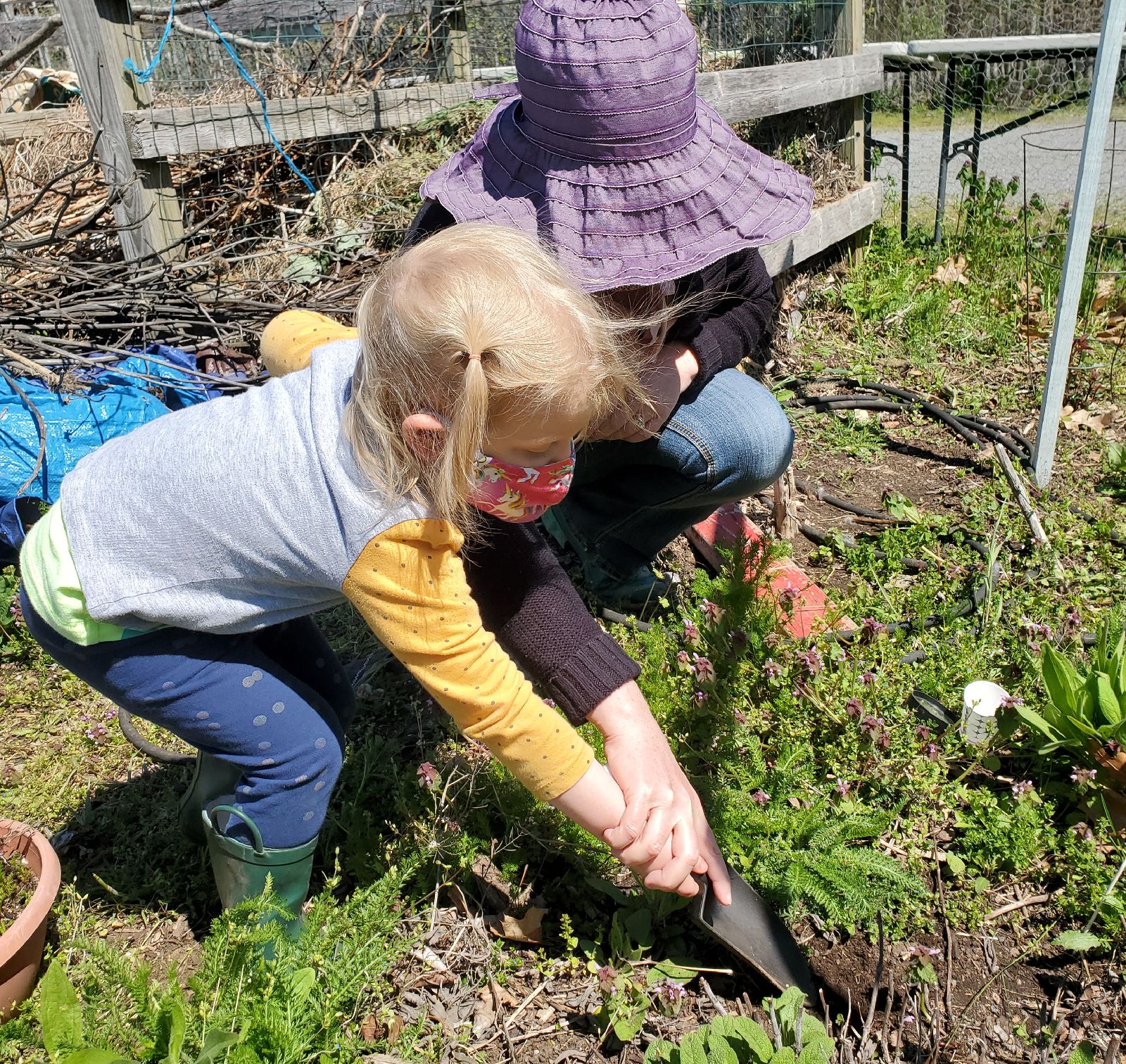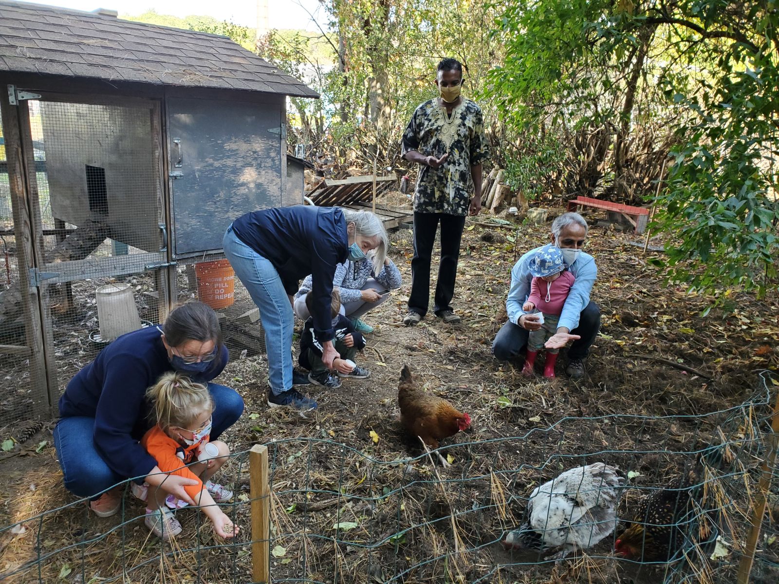 Children and adults participate in a range of activities together including planting vegetables, exploring the compost pile, observing wildlife, playing games, making natural art, singing songs, reading interactive books, going on scavenger hunts, harvesting veggies and herbs, collecting eggs in the coop, and cuddling rabbits in the springtime garden. Every season brings new surprises and new lessons.